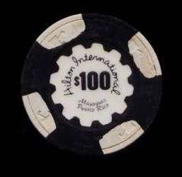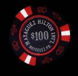 | 41. | Mayaguez Hilton Mayaguez Puerto Rico, 100.00 Black chip, 3 red/white/red inserts, suits/dice inserts, metal inlay