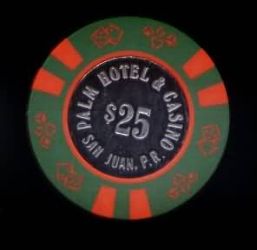 | 43. | Palm Hotel & Casino San Juan Puerto Rico, 25.00 Green chip, suits mold, 6 orange inserts, metal inlay