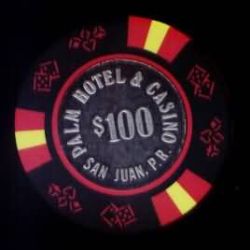 | 44. | Palm Hotel & Casino San Juan Puerto Rico, 100.00 Black chip, suits mold, 3 red/yellow/red inserts, metal inlay