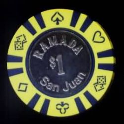 | 53. | Ramada San Juan Puerto Rico, 1.00 Yellow chip, 12 thin blue inserts, suits/dice inserts, metal inlay