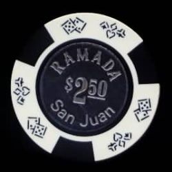 | 54. | Ramada San Juan Puerto Rico, 2.50 White chip, 3 black inserts, suits/dice inserts, metal inlay