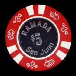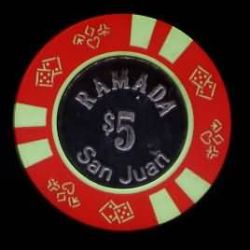 | 55. | Ramada San Juan Puerto Rico, 5.00 Red chip, 6 white inserts, suits/dice inserts, metal inlay