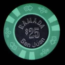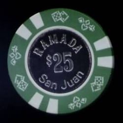 | 57. | Ramada San Juan Puerto Rico, 25.00 Green chip, 6 off-white inserts, suits/dice inserts, metal inlay