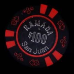 | 59. | Ramada San Juan Puerto Rico, 100.00 Black chip, 6 red inserts, suits/dice inserts, metal inlay