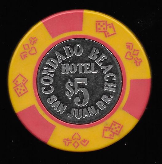 | 15. | Condado Beach Hotel San Juan Puerto Rico, 5.00 Yellow chip, orange inserts, coin in center, Bud Jones