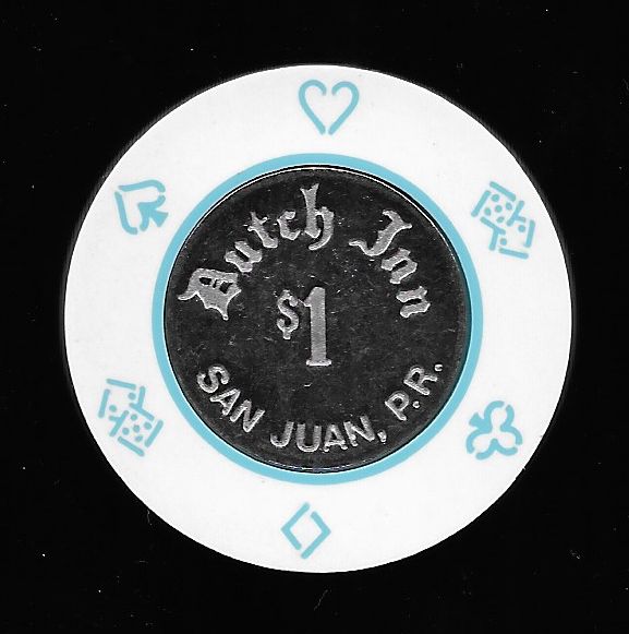 | 25. | Dutch Inn San Juan Puerto Rico, 1.00 White chip, 4 suits/dice blue inserts, coin center