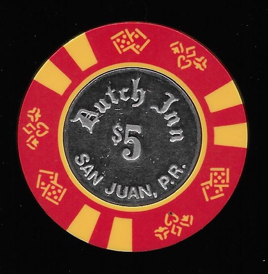 | 26. | Dutch Inn San Juan Puerto Rico, 5.00 Red chip, 4suits/dice yellow inserts, coin center