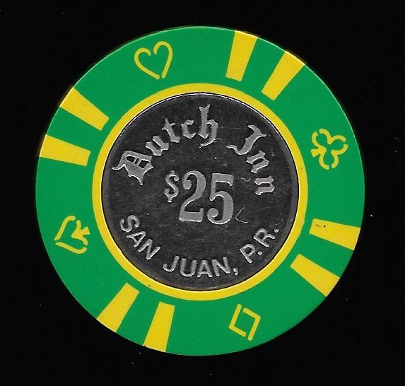 | 27. | Dutch Inn San Juan Puerto Rico, 25.00 Green chip, 4 suits yellow inserts, coin center