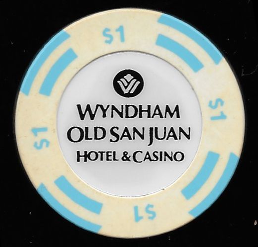 | 62. | Wyndham Old San Juan San Juan Puerto Rico, 1.00 White chip, blue inserts, circle inlay
