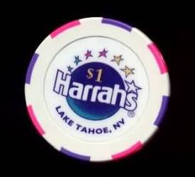| 45. | Harrah's Lake Tahoe NV, 1.00 White chip, stars semicircle design, 4 pink / 4 blue wide thin inserts