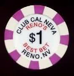 | 25. | Club Cal Neva Reno NV, 1.00 Off-white chip, 8 purple inserts, circle inlay, Reno's Best Bet