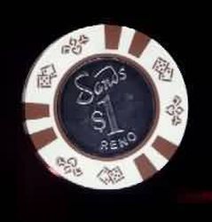 | 120. | Sands Reno NV, 1.00 White chip, 6 maroon inserts, 6 dice inserts, 6 suits inserts, metal inlay