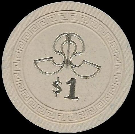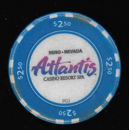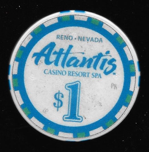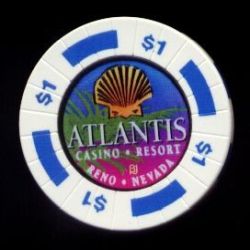 | 4. | Atlantis Casino Reno NV, 1.00 Bud Jones white chip, 4 blue inserts, 24 line incuse, circle inlay, seashell
