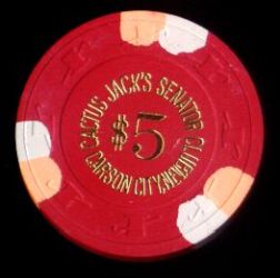 | 42. | (5DNevada) Cactus Jack's Senator Club Carson City NV, 5.00 Red chip, 3 peach / 3 white inserts, hotstamped, H&C mold