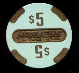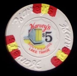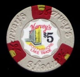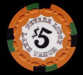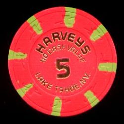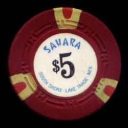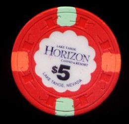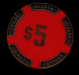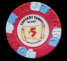 | 43. | (5DNevada) Caesar's Tahoe Lake Tahoe NV, 5.00 Red chip, 4 blue/light blue inserts, circle inlay, house mold, scroll