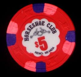608. | (5DVegas) Horseshoe Las Vegas NV, 5.00 Blue chip, 3 red inserts, Arodie mold, circle inlay
