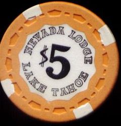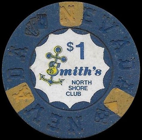 627. | (5DNevada) North Shore Club, Smith's Lake Tahoe NV, 5.00 Mustard chip, Nevada mold, scalloped inlay, 3 navy inserts, anchor