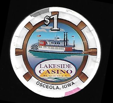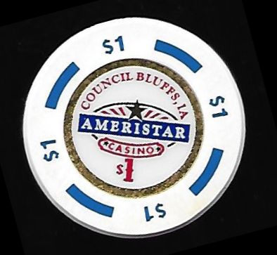 | 10. | (Iowa) Ameristar Casino Council Bluffs IA, 1.00 White chip, 4 horizontal blue inserts, circle inlay, gold circle, riverboat design