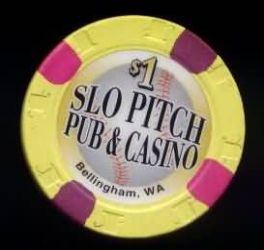 | 539. | (Washington) Slo-Pitch Pub & Casino Bellingham WA, 1.00 Yellow chip, H&C mold, 2 purple / 2 magenta inserts, large softball